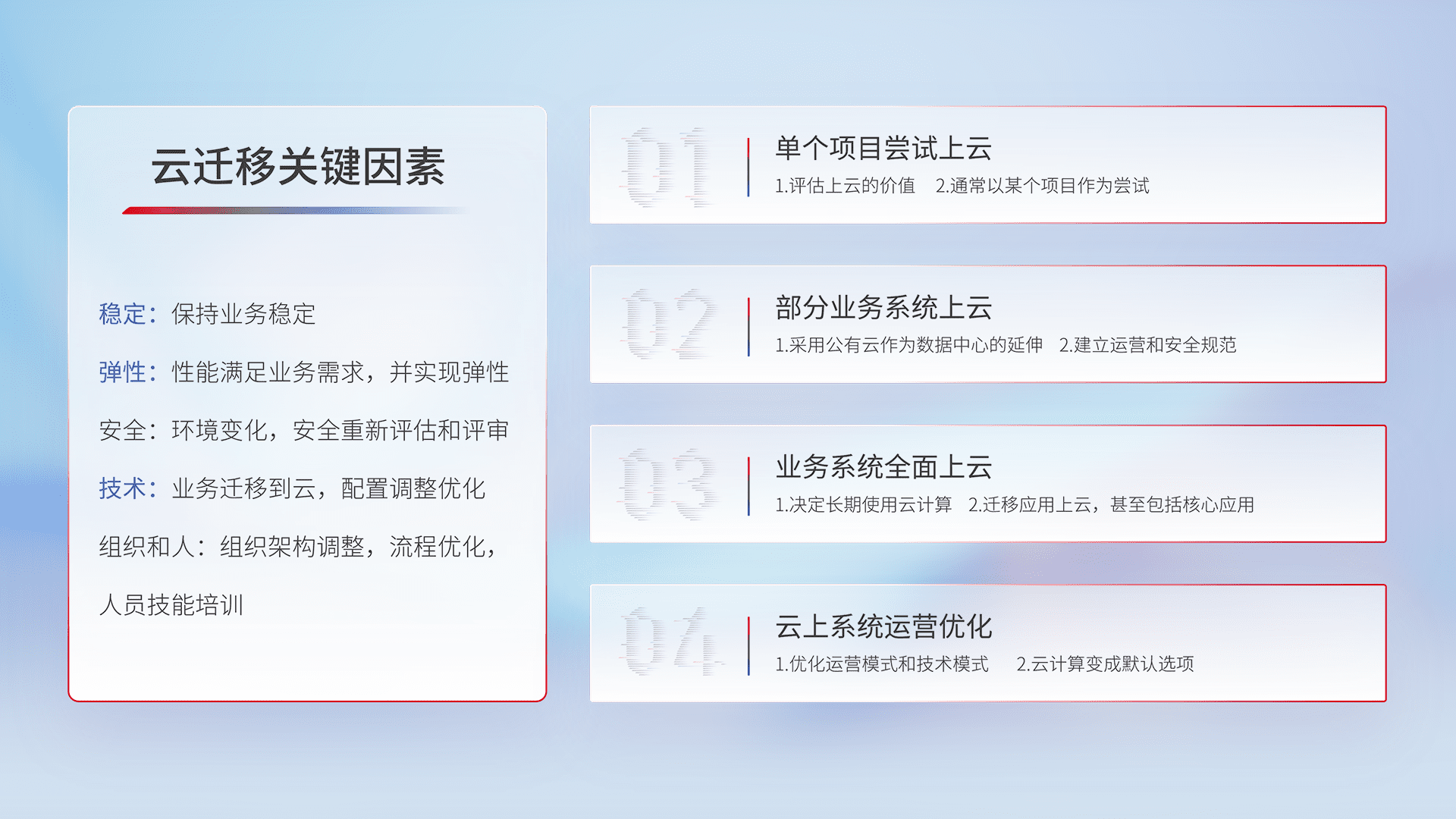结合实际业务,,,,从规划设计、、云平台选型、、、云原生改造、、数据迁移、、、、集成交付,,,,迁移全过程为客户识别最佳上云路径,,,做好风险识别管理,,设计网络架构、、、身份权限、、、安全审计合规、、操作审计、、日志审计、、、、监控告警策略、、多站点容灾设计等,,对云上基础设施进行整体规划,,,,提升IT治理水平,,,以满足弹性、、高可用、、、高性能的需求。。。
